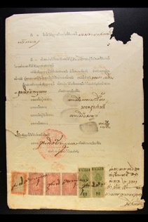 THAILAND REVENUES ON COMPLETE DOCUMENT 1948 complete two sided Court Document in Thai bearing 1909 Judicial 1s on 2a and 10s on 4a (Barefoot 36 and 39), plus "Elephant" 1b (Barefoot 54) x 3, and 4b (Barefoot 71), some peripheral faults to the document not affecting stamps
